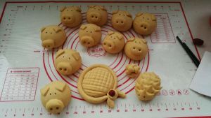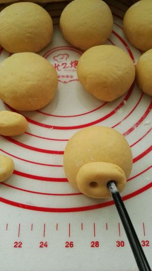 椭圆形的面团背面用筷子抹点水粘猪头上,两只筷子沾面捅鼻孔。