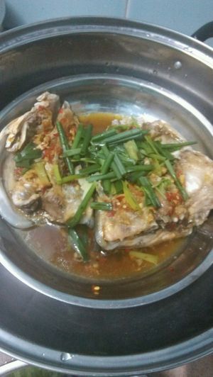 在“SPA”好的鱼头上倒入适量酱油 蚝油 白醋 白糖 味精 白胡椒(量按照排序依次减少) 再将炒好小料淋在鱼头上,冷水上蒸锅