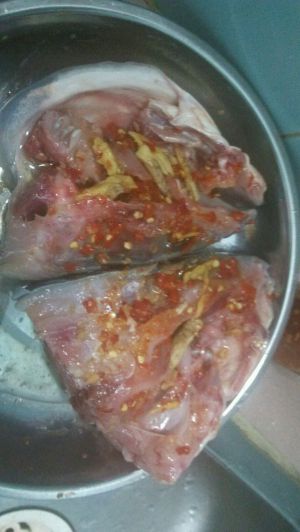 买回鱼头洗好,放盐,姜,自炸蒜米
