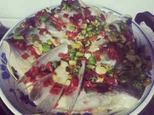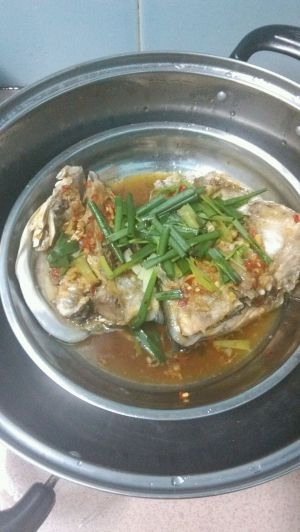 锅里烧开水后,放入鱼头隔水蒸5分钟后倒掉腥水,在鱼头上铺上剁辣椒和炒好的姜蒜,再大火蒸15分钟。