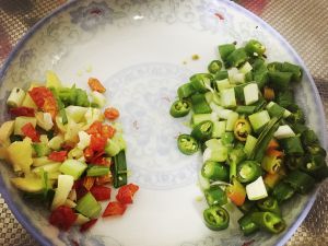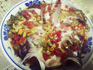 然后放些自制剁椒,可以吃辣可放多点,然后放入蒸十分钟!