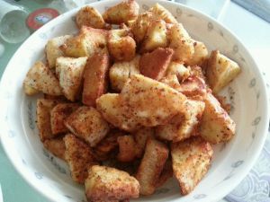 馒头丁微微煎黄,放入1勺孜然、1勺辣椒面,翻炒一下,好了,味道很棒啊