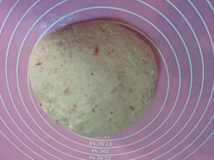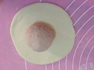 将发酵好的面团分成小块,白色面团擀成面饼,粉色面团揉成面团,将面团放入面饼上