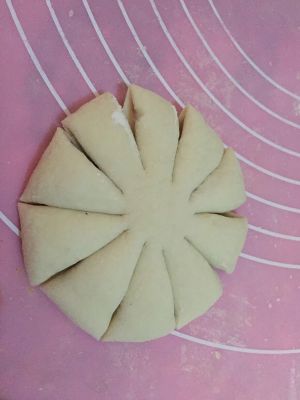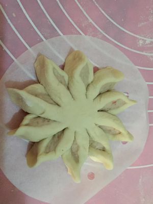 将切好的花瓣向上扭转一下,形状如图,里面的粉色面团就显露出来了