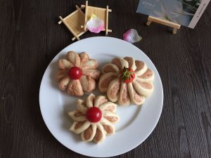 静置十五到二十分钟二次发酵,发酵好的花朵热水上锅,计时二十分钟即可。用圣女果或者草莓装饰花心。