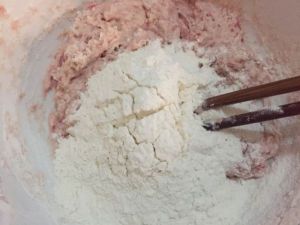 将面粉个泡打粉混合过筛加入混合果泥中,要分次少量的加入搅拌成絮状