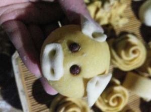 取2克小面团做耳朵,再画上可爱的表情,室温发酵至1.5倍大