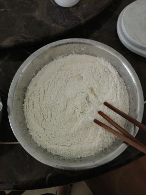 二、面、麦、糖放在一起搅拌均,倒入拌好的水、酵母,用筷子搅拌好。