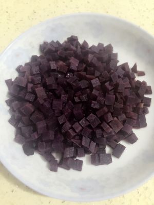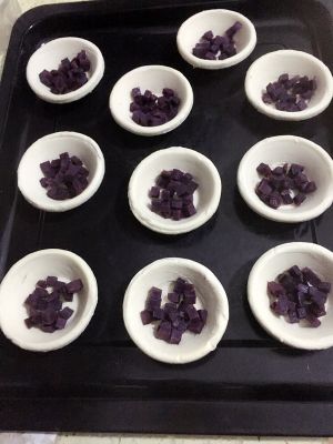 将蒸熟的紫薯分成10等份放入蛋挞皮内