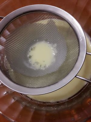 将蛋清分离,取出蛋黄,当然了。大家可能觉得这样很浪费,但是我亲自实践将整蛋放入进行制作,结果会有很重的腥味,蛋清可以烧汤神马的~将蛋黄用打蛋器打散,越散越好