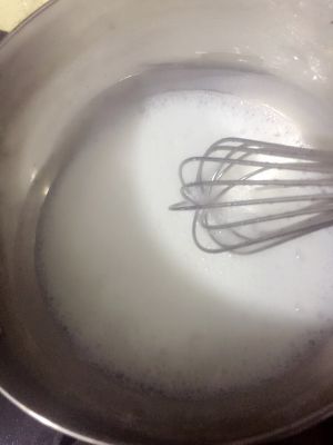 炉子开小火,将混合后的牛奶跟奶油加热。一边加热一边倒入糖,糖溶化即可,千万别煮开了。