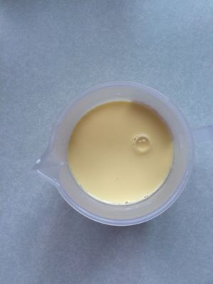 将牛奶,淡奶油,白砂糖,吉士粉,菜谱中的用量一起倒入量杯中,充分搅匀,让糖和吉士粉融化,我是常温下操作的。
