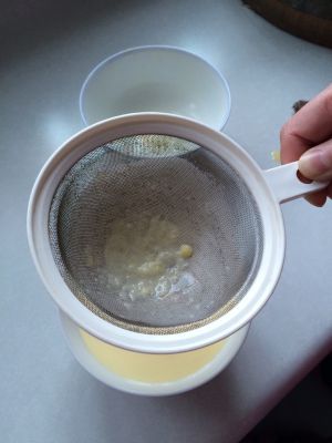 将蛋黄打散,要打的细致一些,然后把量杯中的混合物倒入蛋黄液中,再一次充分搅匀。搅匀后将蛋挞水过滤2次。