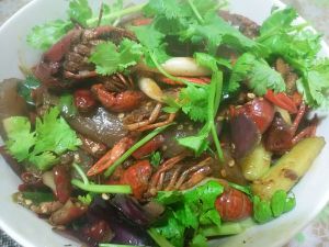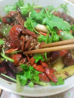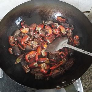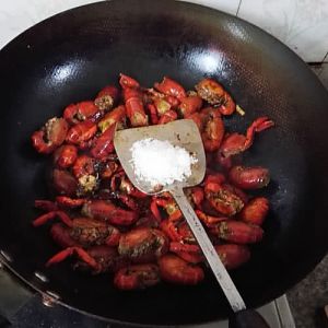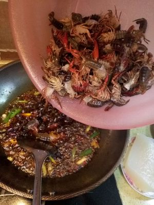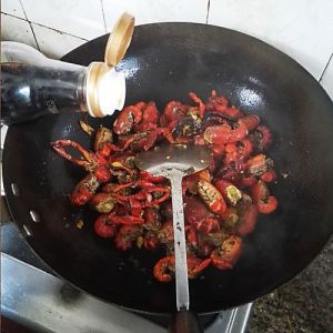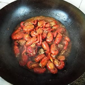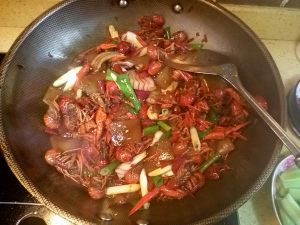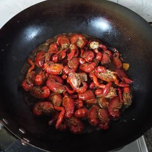 炒香后,放入小龙虾,一直翻炒