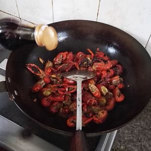 待虾壳红了之后,倒入一大勺的老抽
