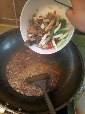 放入菜油,调和油,豆瓣炒香后放入各种香料,少许大葱,豆瓣,花椒炒香