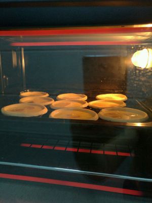 挞皮摆好在烤盘上解冻,需要二十五分钟左右,烤箱预热210度25分钟