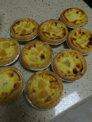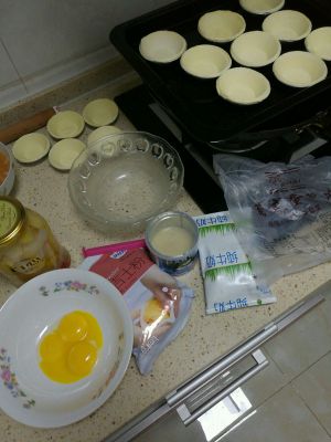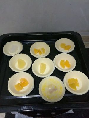 摆放水果,加蛋挞液。蛋挞液一定要搅匀。以我的经验,蛋挞液可以放九成。出来更好看。