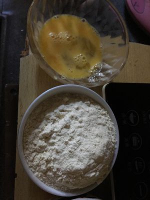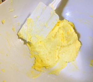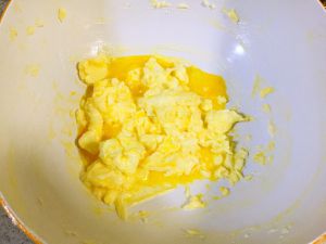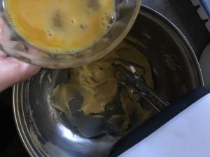 糖粉充分和黄油搅拌均匀后。分三次加入蛋液。
