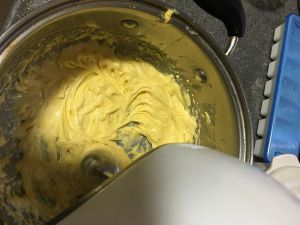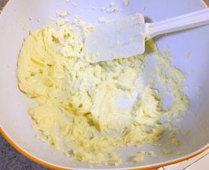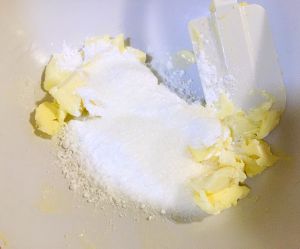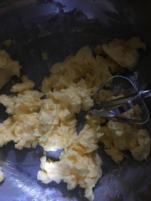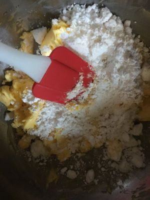 糖粉分三次加入黄油,用电动打蛋器进行打发,每次糖粉和黄油完全融合后,再加下一次。