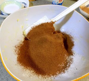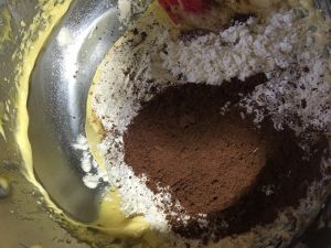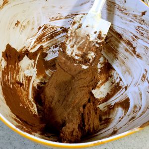 加入可可粉和面粉。搅拌均匀