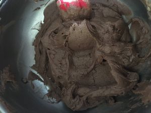 不断翻拌或用手持打蛋器不断搅拌至没有干粉,可可粉和黄油等充分混合