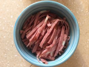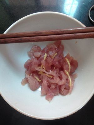 大米放入锅中,加五碗水,大火煮开。煮开后放入腌制好的肉丝。