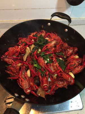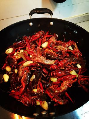 虾料炒香后倒入之前过油的小龙虾,翻炒