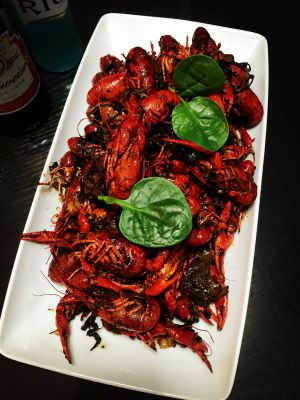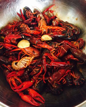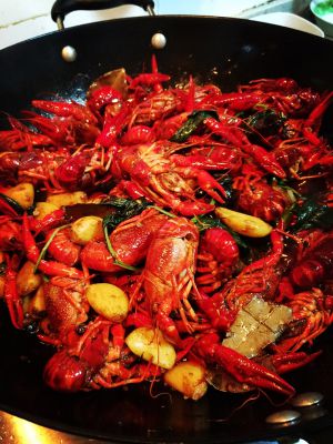 热锅热油,高温下虾,炸至亮红,捞出备用! 热锅热油,先下锅葱段姜片蒜头煸香,再下八角沙仁白芷,再下陈皮甘草草果,炒至泛黄加入花椒和干辣椒快炒。最后加入豆瓣酱和秘制虾酱! 把一半的虾倒入酱锅内,加入适量的鸡精、盐和醋,把剩余的虾都倒入锅内,加入啤酒不加水!加入秘制香油和秘制虾酱, 啤酒烧开,并不断翻动小龙虾,待翻动均匀,加盖闷煮至少半小时