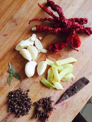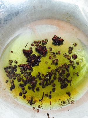 锅内倒油,冷油放入花椒麻椒和八角。小火炸至有香味。