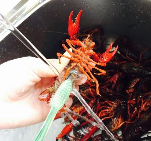 刷干净后,把小龙虾尾部中间的一块壳儿拧断,抽出食线。这样吃起来很方便,也很过瘾
