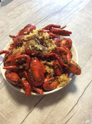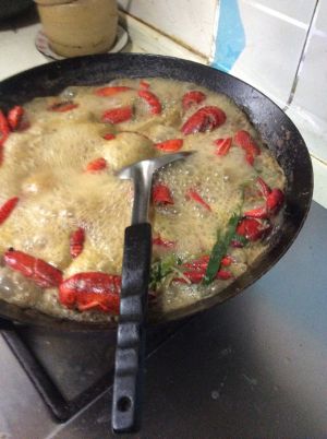 油好了放入火锅调料,生姜片,大蒜,干辣椒,花椒,泡椒,小米椒,二荊条,豆瓣,八角,山奈,桂皮,大葱等以上调料,炒香了倒入龙虾翻炒!