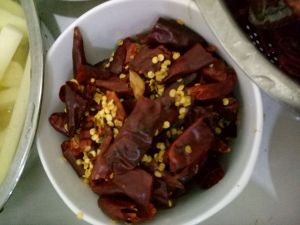 下辣椒,麻椒,香叶,此时中小火,不然容易糊。切记。辣椒变浅色,出了香味儿,开始下一步。