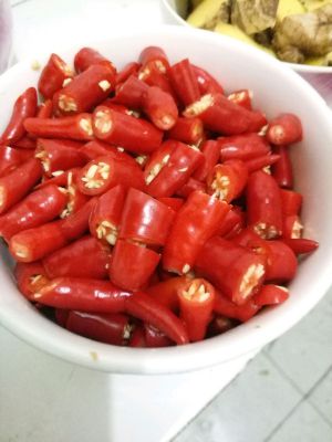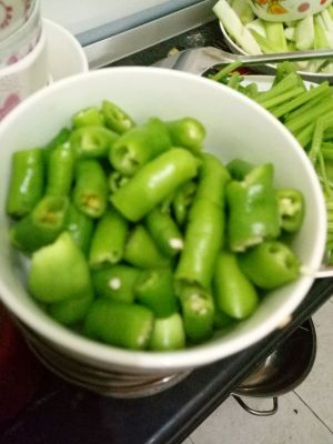 辣椒段,麻椒,香味3片,葱姜蒜,白糖。