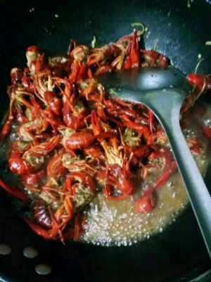 放进炸过的龙虾进去一同爆炒,把所有的调料加进去,倒进啤酒煮开后,小火十分钟收汁