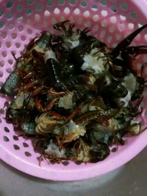 龙虾去头,因为头部黄很多所以要多次清洗,尾部抽筋,晾干