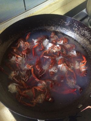 倒入干辣椒、麻椒一起翻炒。干辣椒变色时放入小龙虾大火爆炒三分钟左右。