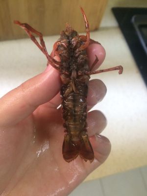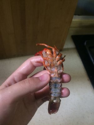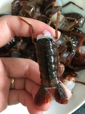 抓住小龙虾尾部中间的那片尾巴,一拉就可以把虾肠拉出来,拉出来后的小龙虾尾巴就是这样的,少了一片!