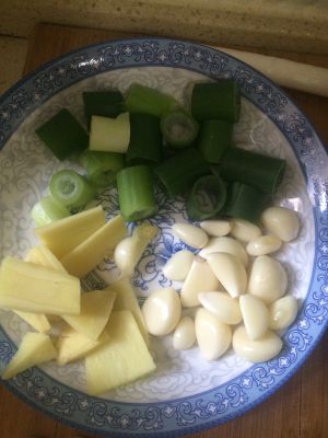 葱姜蒜洗干净,大葱切一寸左右的段、姜蒜切片备用。麻椒一小把、干辣椒一小把切段备用。