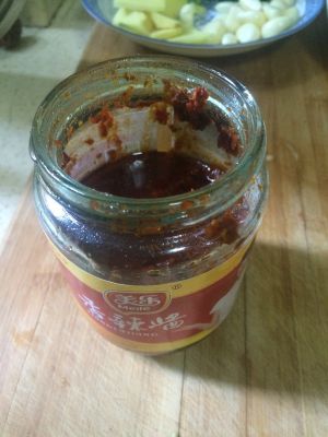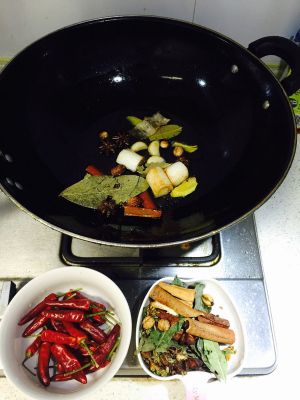2锅烧热,把大葱炒香,放香料,麻辣酱料,生姜大蒜,白沙糖