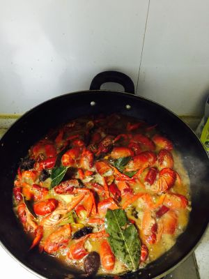 3把虾炒红,放白酒,脾酒把虾盖过,盖上锅盖,烧20分钟