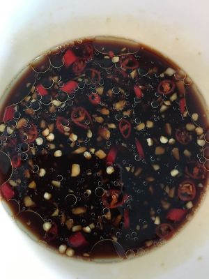 我的酱油醋用的是海天的特级金标生抽,普通米醋,料酒一点,还有姜末,蒜蓉,辣椒装饰,不辣的,一点点白糖,最后加一点芝麻油!好香!