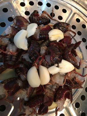 在蒸锅里加水,水里也加几片姜片和一点料酒!在蒸架底部铺上姜片,再铺小龙虾,加一点大蒜!大火蒸熟!为了能够消灭寄生虫之类的!我是大火蒸35-40分钟的!有的亲如果觉得时间太长,可以适当减少!