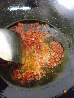 将大蒜和姜切片,辣椒切段,油下锅,七成熟的时候放入郫县豆瓣酱,,小火翻炒。