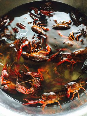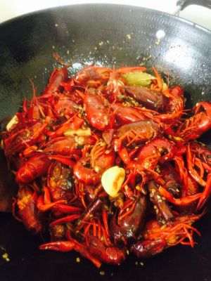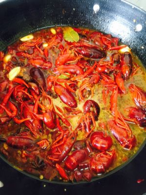 倒入活小龙虾(因为是活的,放进去后需要立刻盖上盖子),半分钟后开盖翻炒,加入料酒,啤酒,酱油,大火烧开,加入少许糖提鲜,加盐。熬制十分钟,浸泡一个小时
