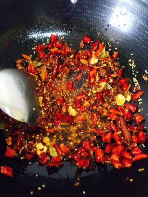 锅中放油,待油热后,放入干辣椒,蒜,麻椒,煸炒出香味,
