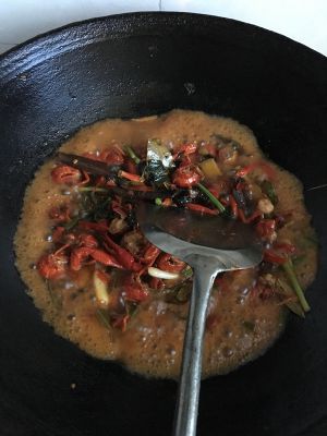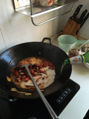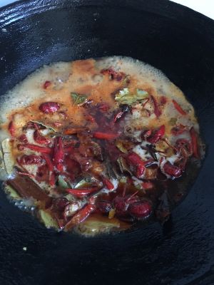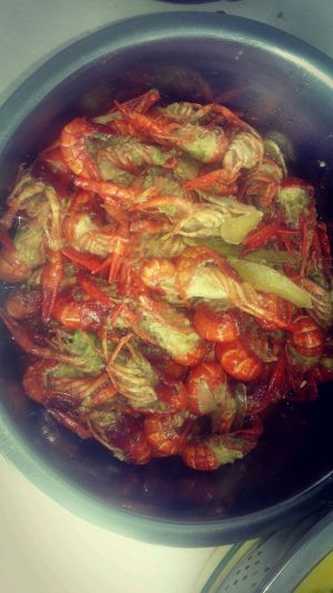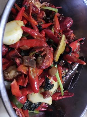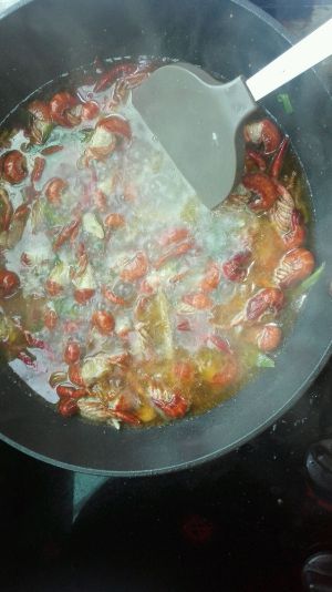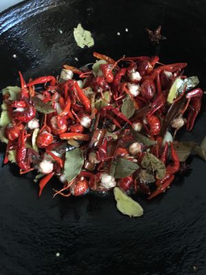 另起锅放入干辣椒,姜,蒜,放入炸好的龙虾,翻炒片刻,加入水和所有调料,小火20分钟,煮得越久,味道越好,最后洒上葱花