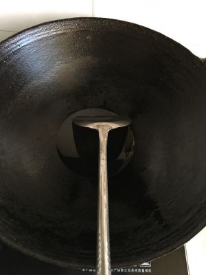 锅烧干放油加入生姜,慢火烧到七成热,放入生姜是避免油会渐起来