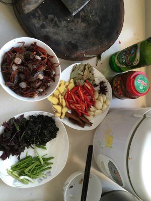 用料备齐,婆婆家佐料不是很够。建议还可以加上适量的花椒,草果两颗,还有大葱一颗,干红辣椒适量。干辣椒可以提香用的。小龙虾,记得在虾尾部剪开,这样能更入味。