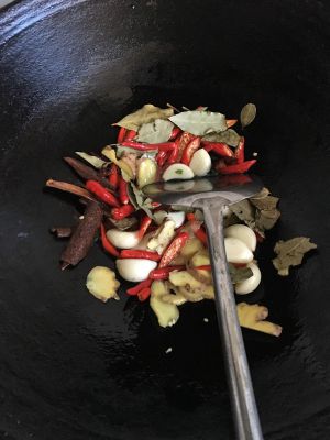 油热,先放豆瓣,冰糖,姜片,葱结,然后就可以把胡椒除外的调料都放了